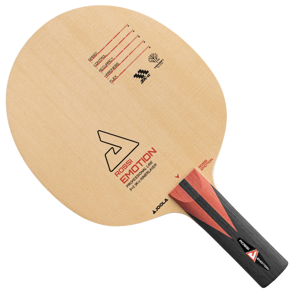 Het hout speelt zeer gecontroleerd dankzij de carbonvezel-inzetstukken. In vergelijking met ander hout met carbon toevoegingen, maakt de Joola Rossi Emotion indruk met zijn speciaal geselecteerde Hinoki-oppervlak dat een relatief zachte demping en een hoge vluchtcurve heeft. Het zorgt voor een optimale balans tussen gevoel in passief en snelheid in actief spel.