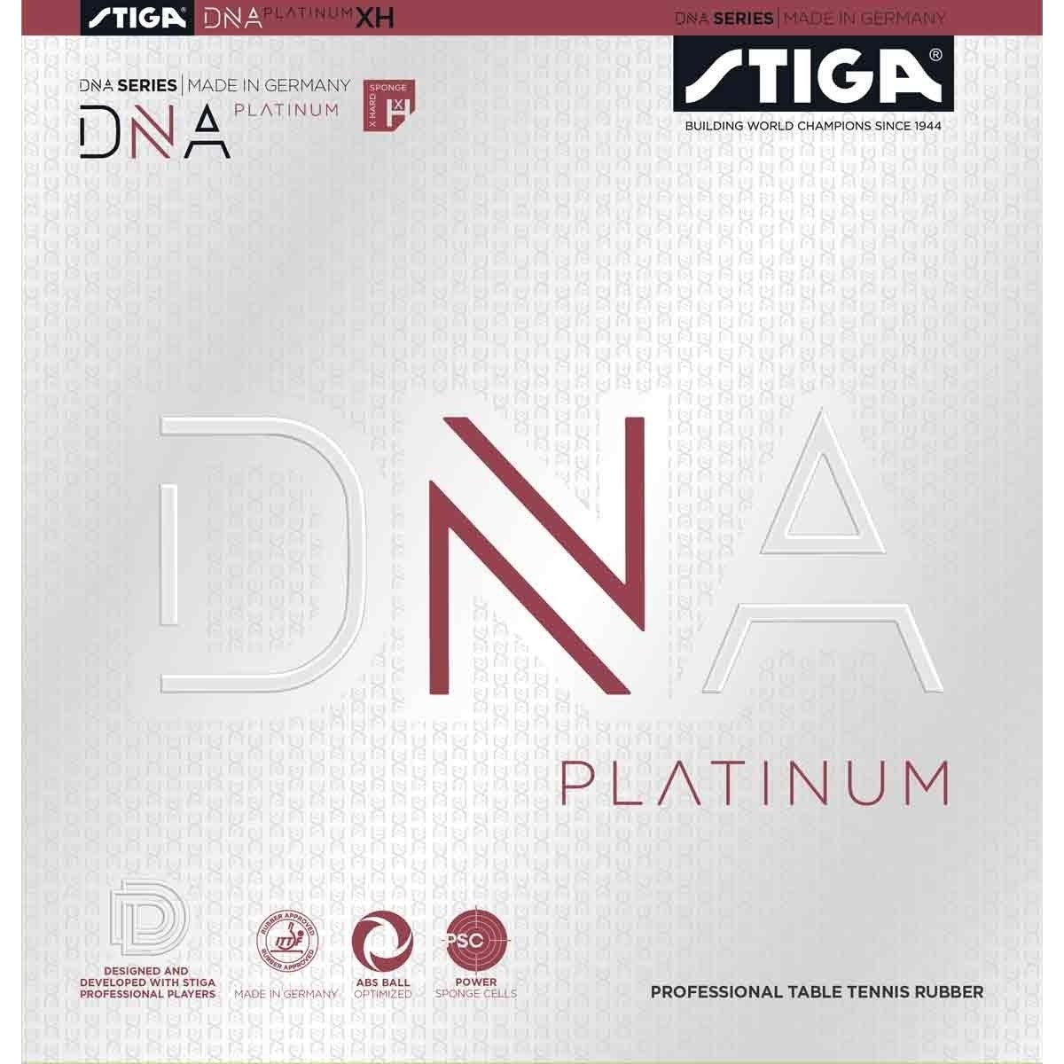 DNA Platinum is een eersteklas tafeltennisrubber van wereldklasse, de nieuwste toevoeging aan de DNA-serie van Stiga met een nieuwe generatie tafeltennisrubbers uit Duitsland. Dit rubber is ideaal voor professionele spelers met een zeer aanvallende speelstijl die de hoogste kwaliteit materialen verwachten. De unieke samenstelling biedt een uitstekende grip, waardoor spelers de bal vanuit uitdagende hoeken kunnen slaan. De korte noppen en dunne bovenlaag maken het mogelijk dat DNA Platinum een dikkere spons kan bevatten (tot 2.3 mm), wat zorgt voor extra snelheid en kracht in het spel. Dankzij de PSC (Power Sponge Cell) technologie krijg je een langere baan met meer kracht in je slag en een agressieve boog in lus-spelen. De spons poriën verbeteren ook het contact tussen het rubber en het blad, wat resulteert in dat gewilde, heldere geluid bij elke slag. De zachte spons verhoogt de contacttijd tussen rubber en bal en geeft een beter gevoel en controle zonder significant snelheidsverlies. Bovendien produceert het rubber dat kenmerkende klikgeluid. De extra harde onderlaag is ontwikkeld voor spelers die op zoek zijn naar de hoogst mogelijke snelheid, en biedt de benodigde kracht en snelheid om duels zeer snel en efficiënt uit te voeren. DNA Platinum is ook geoptimaliseerd voor ABS-ballen en heeft dankzij de unieke samenstelling van natuurlijk en synthetisch rubber een aanzienlijk langere levensduur.