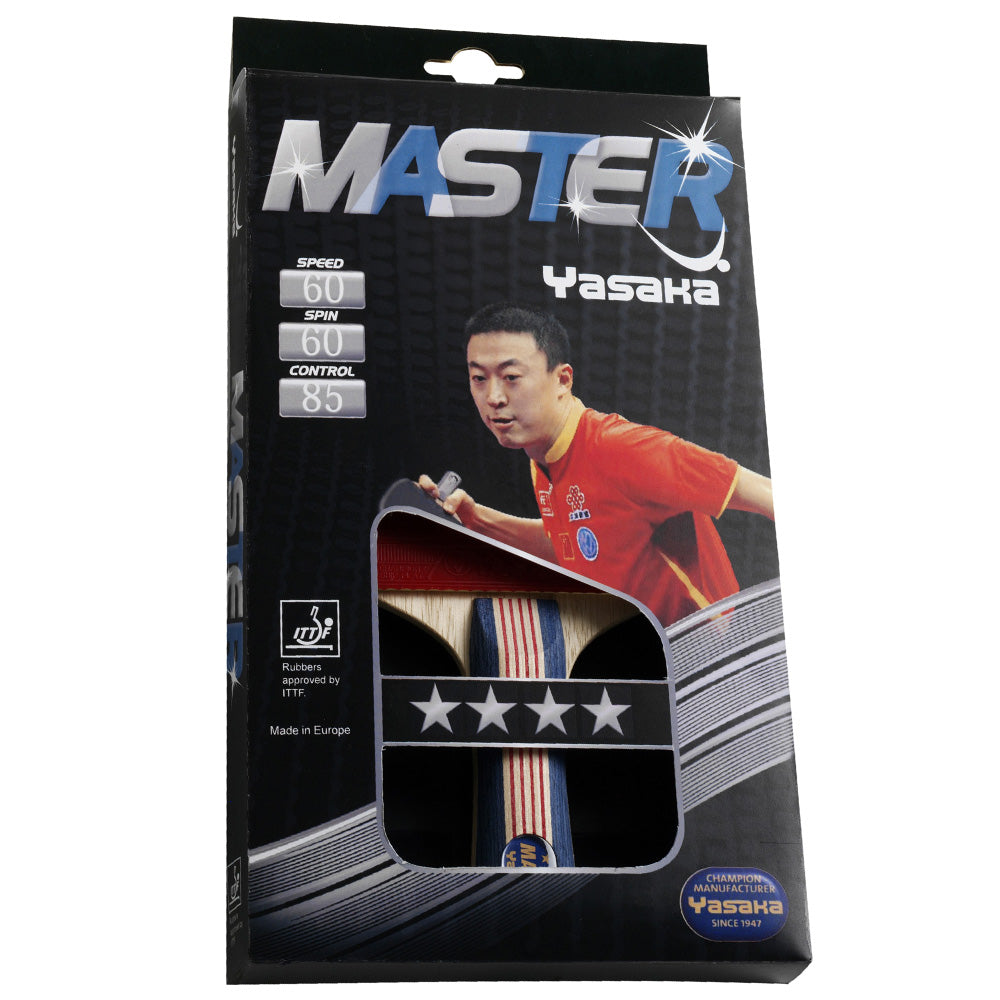 Master is een 4-sterren Yasaka bat met een rubber met goede spin-eigenschappen, geschikt voor ervaren recreatieve spelers en jonge clubspelers. Met kleurvol concaaf handvat met een acryl lens.